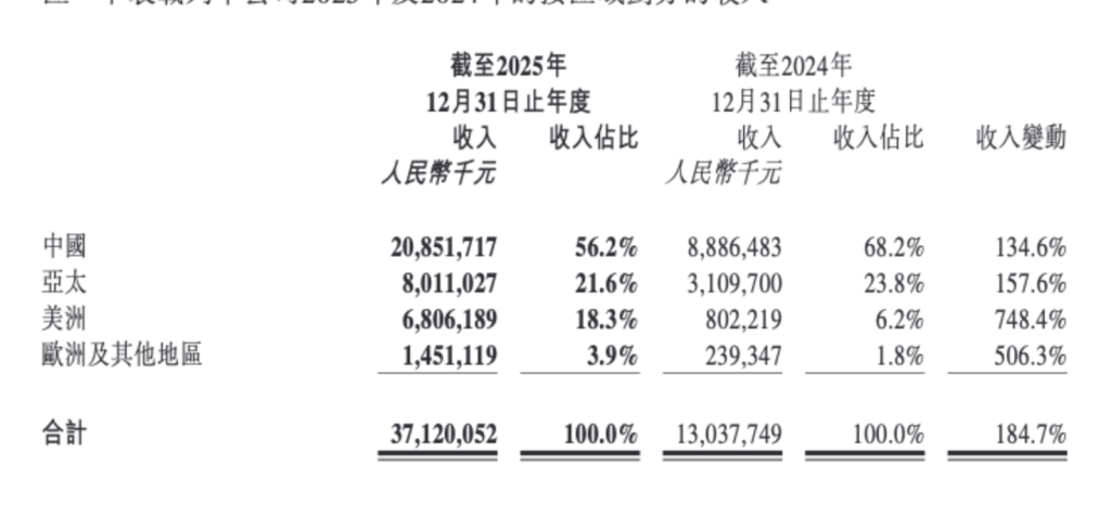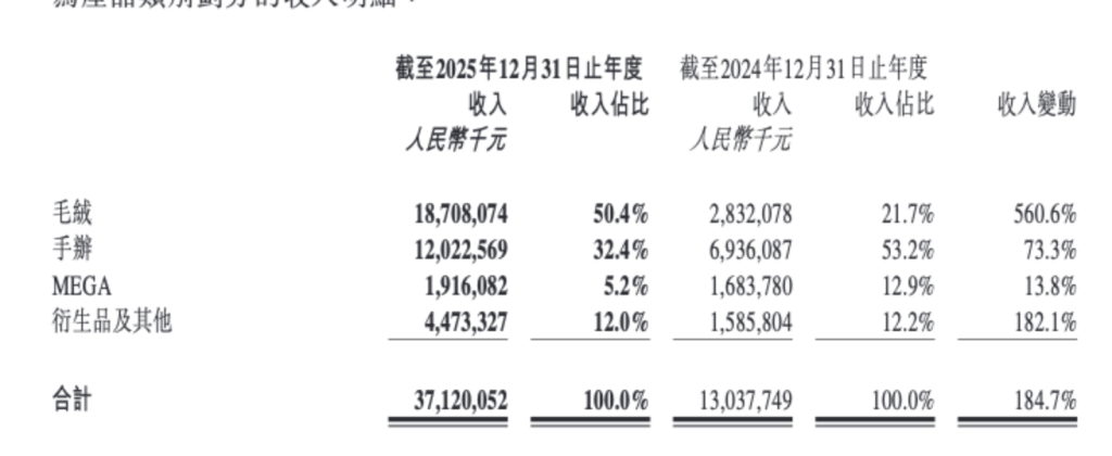 按品类来看,2025年,泡泡玛特的毛绒品类实现营收187.1亿元,同比增长560.6%,首次成为该公司收入占比最高的产品品类,占比为50.4%;手办同比增长73.3%至120.23亿元,收入占比为32.4%。